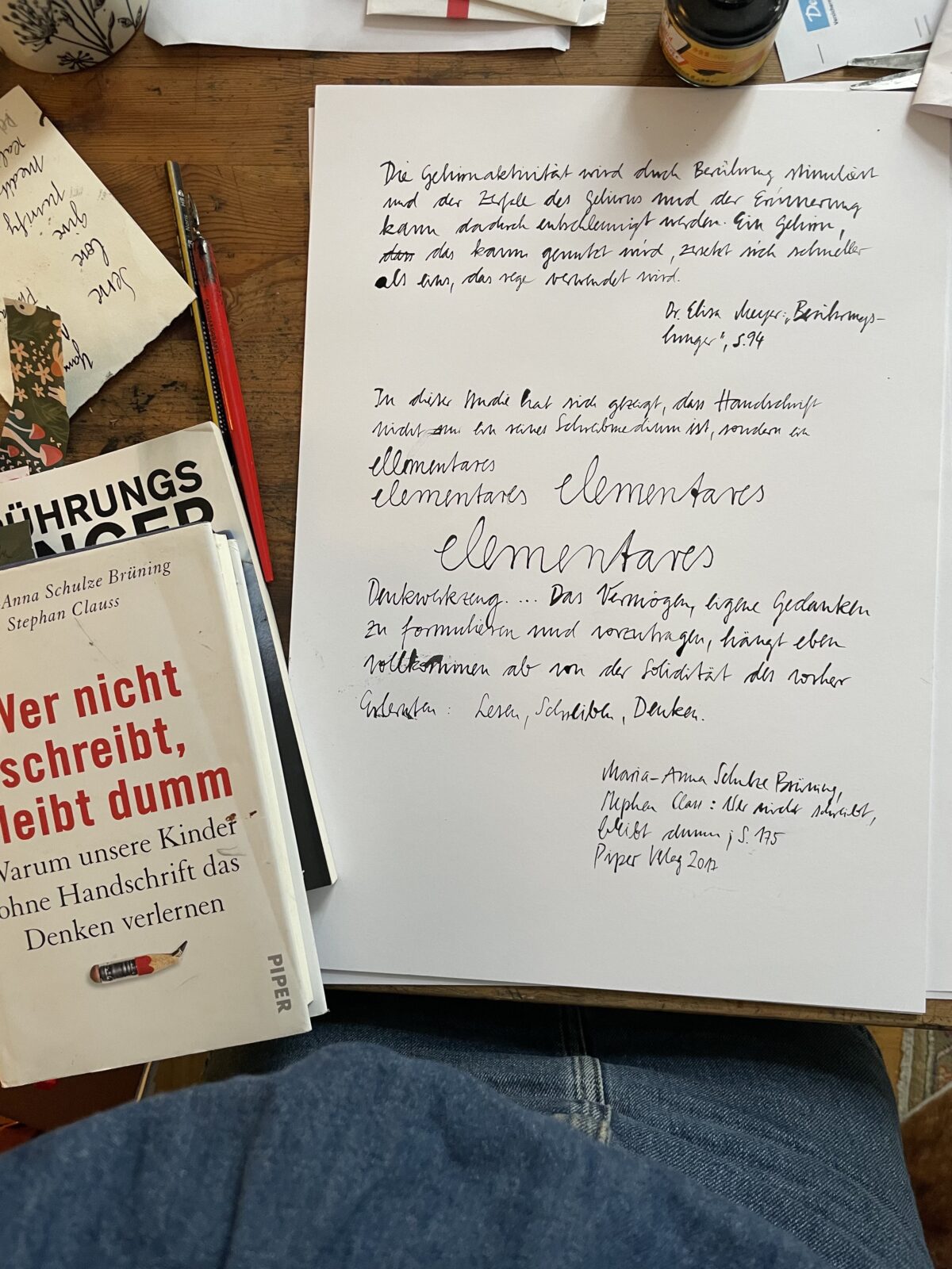 Über die Hand, das Auge, die Netzhaut ins Gehirn hinein – und dann wieder schreibend lesend auf einen Punkt fokussiert hinausgeflossen, permanente Auge-Hand-Koordination, ein psychischer Raum für die Persönlichkeit entsteht. Je mehr Gehirnareale dabei beteiligt sind, desto länger und stärker bleibt der EinDRUCK, die Erinnerung: Magie!