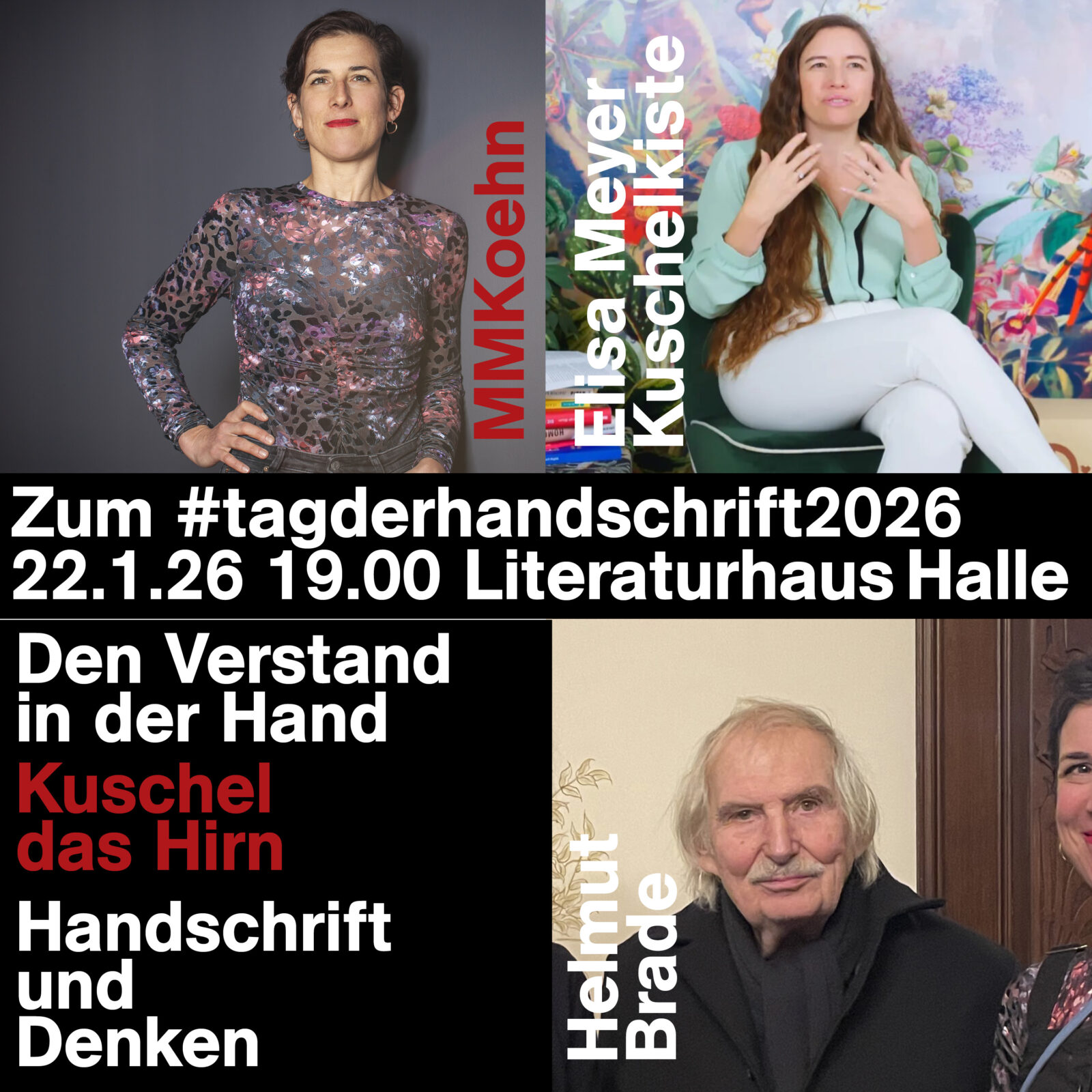 Miteinander sprechen Helmut Brade, Maria Magdalena Koehn (MMKoehn) und Gäste: Beim vierten Gespräch über die Handschrift geht es um die Neuroplastizität des Gehirns und Körperintelligenz, wie durch das Üben „vom Wechsel von Abstrich (Grundstrich) und Aufstrich (der Fortbewegung nach rechts)“ (Renate Tost) durch die Handschrift, die essenziell feinmotorisch wichtigen Grundlagen unseres autonomen Denkens gebildet werden, um in einen Schreib- und Denkflow zu kommen, was zur Formung der Persönlichkeit, des Denkens, der freien Meinungsäußerung, der Bildung wichtig ist, und damit dem Erhalt der Demokratie dient. Die Gedanken sind frei. Ich denke also bin ich.
